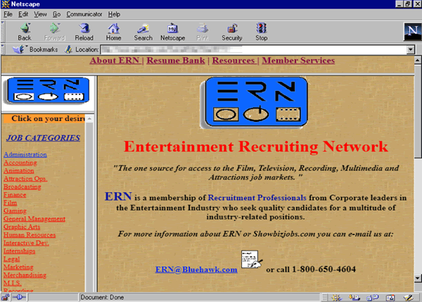 Originally named Entertainment Recruiting Network, the company was started by two HR professionals from Disney, Paul Buss and Jim Kocher. ERN was the online version of what were then monthly recruiter mixers in LA attended by representatives of most of the studios, music labels and industry organizations. The first confirmed hire from a job ad was a trademark attorney for Paramount Pictures.